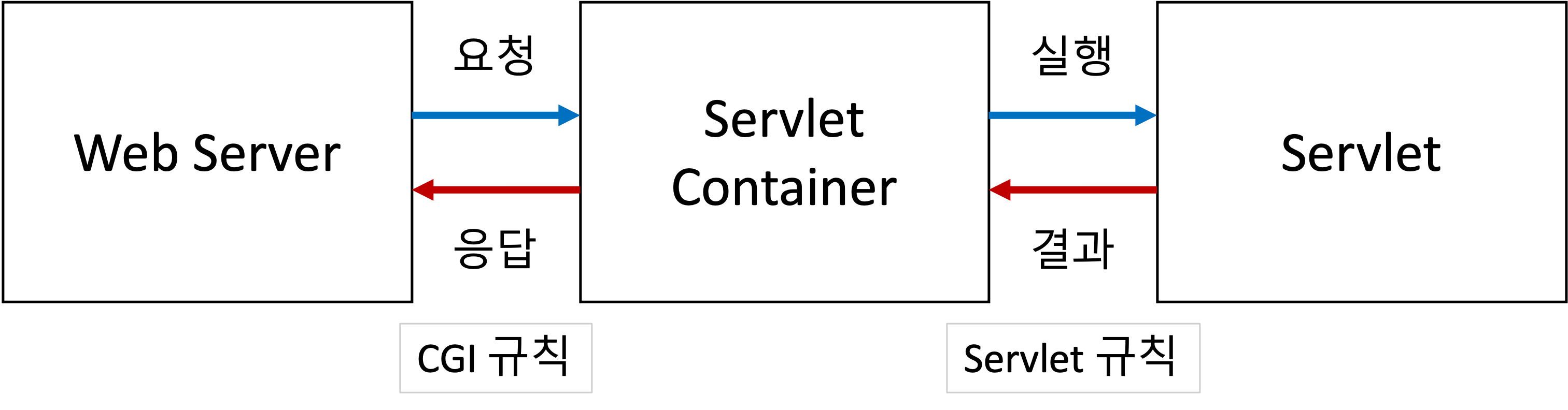 위 그림을 보면 웹 서버는 서블릿 컨테이너와 CGI규칙으로 데이터를 주고 받고, 서블릿 컨테이너와 서블릿은 Servlet 규칙으로 데이터를 주고 받는다. 여기서 우리가 서블릿 프로그래밍을 한다는 것은 Servlet 규칙 즉 인터페이스를 구현하는 것이다.