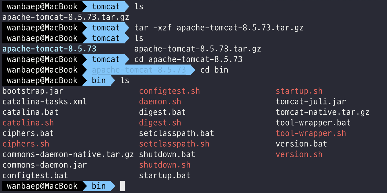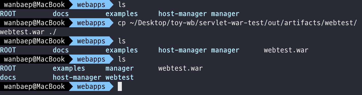 위에서 잘 보면 하나의 디렉토리 단위로 애플리케이션을 구성한다는 점도 확인 할 수 있다. 그리고 수정된 내용을 추가해서 빌드한 war 파일을 업로드 해두면 Tomcat에서 이를 인지하고 다시 압축해제를 하여 변경된 애플리케이션의 내용이 배포되도록 한다.