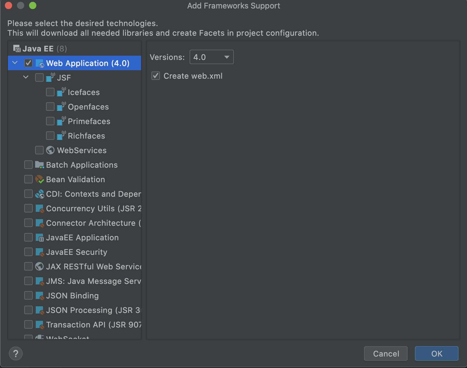 프로젝트 우클릭 > Add Framework Support... 선택 후 Web Applicaiton 추가