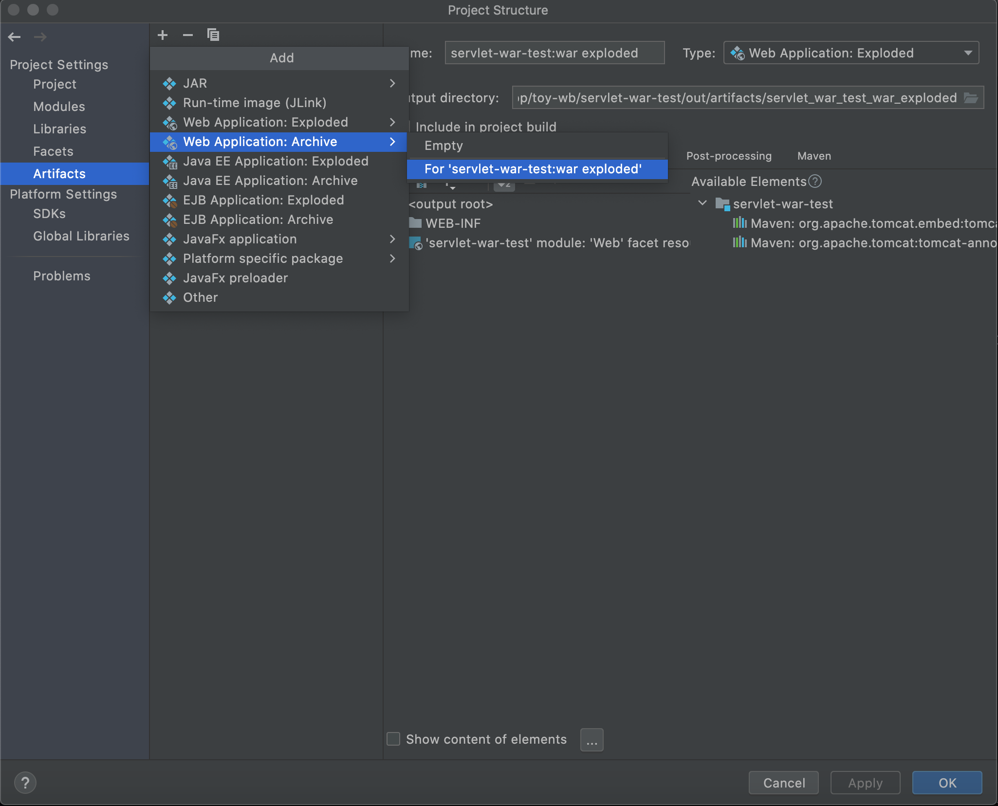 war 로 프로젝트를 패키징 하기 위해 war Archive 설정이 필요하다.