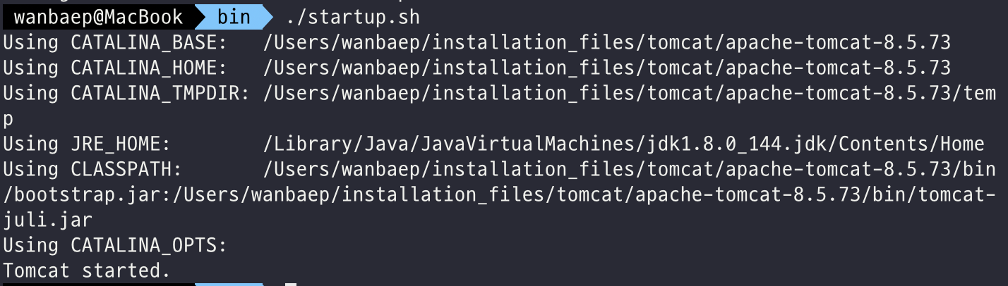 Tomcat 은 간략한 테스트를 위해 tar.gz 를 다운받아 bin/startup.sh 로 실행했다.