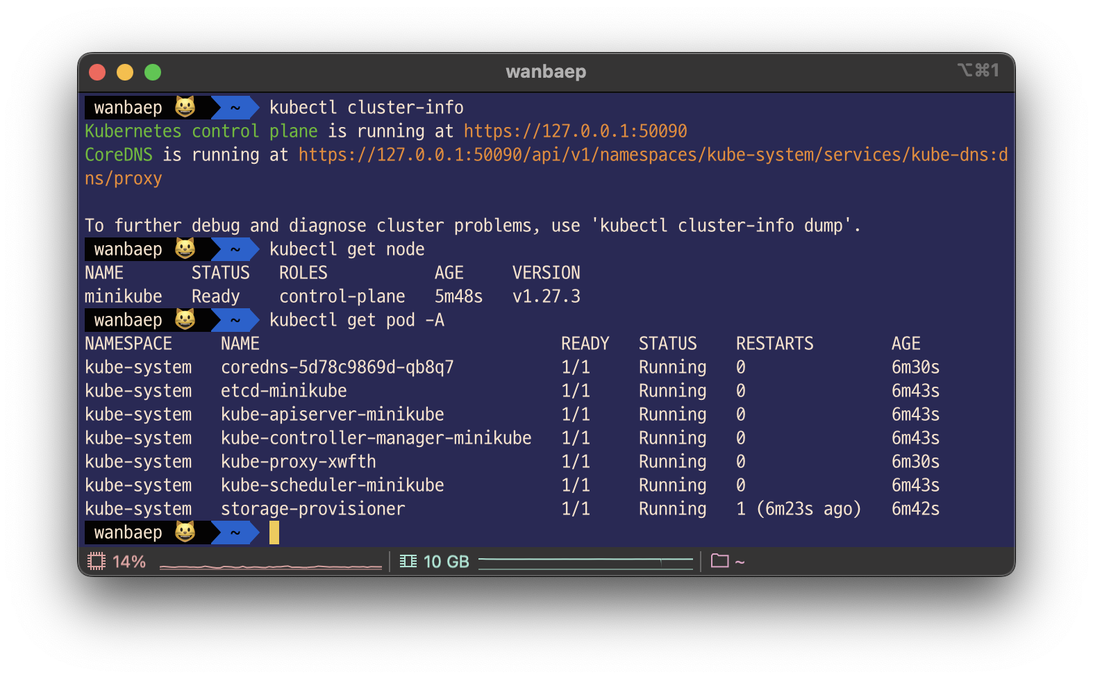 위에 minikube start 를 수행한 내용을 살펴보면 컨트롤 플레인, node resource 설정(CPU, memory), RBAC 구성, Network 관련 설정 등 쿠버네티스 구성에 필요한 정보들을 수행하는 것을 확인할 수 있다.
