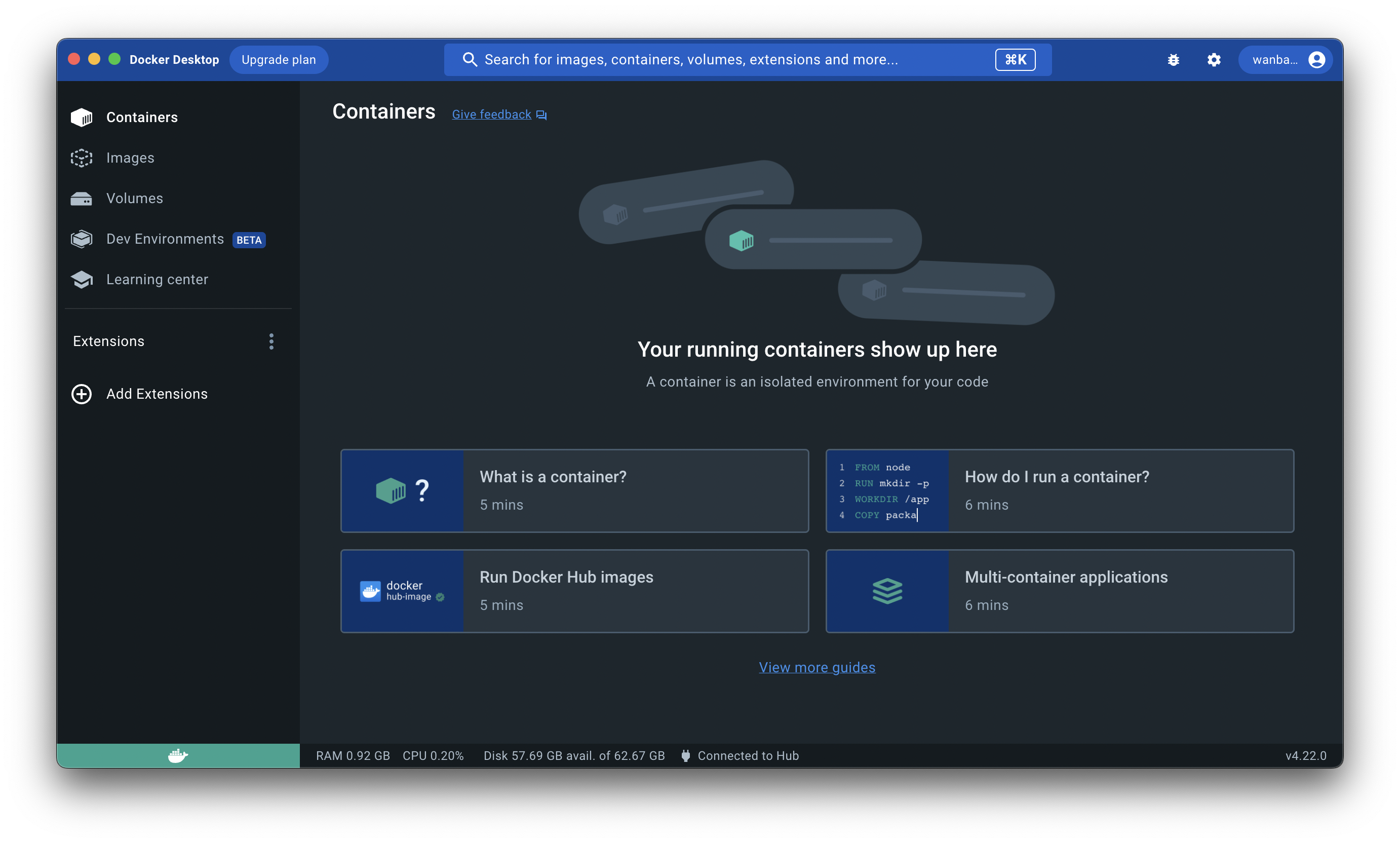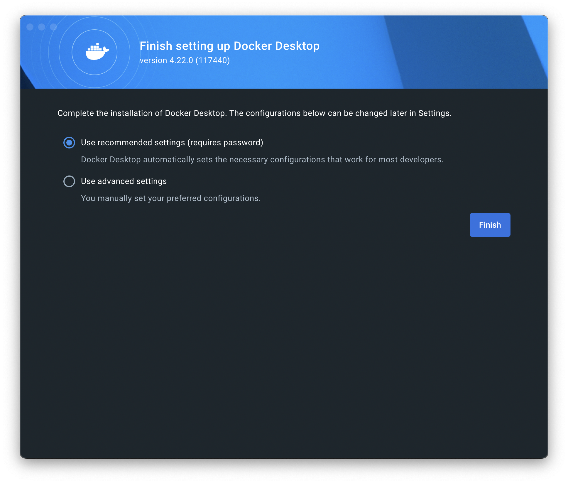 Finish 를 누르게 되면 설치가 완료되고 docker 실행 시 아래와 같은 화면이 나온다..!