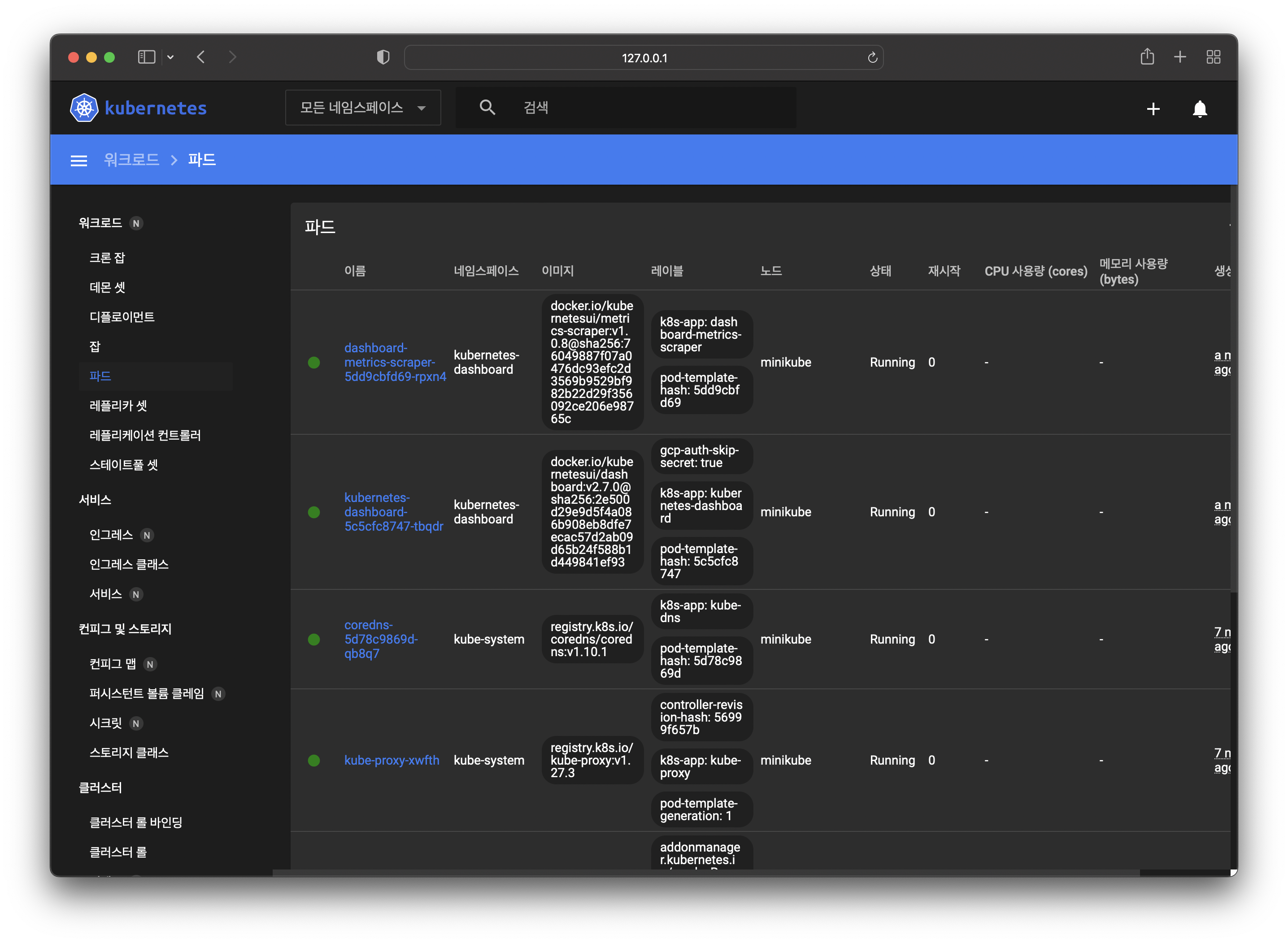 이러한 정보들을 web에서 dashboard형태로도 확인할 수 있는데, Terminal에서 minikube dashboard를 입력하면 대시보드가 실행되며 아래 화면이 나온다.