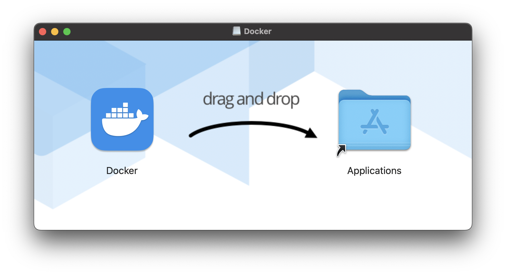 dmg파일을 다운로드해서 drag and drop을 하면 Docker 설치가 완료된다.
