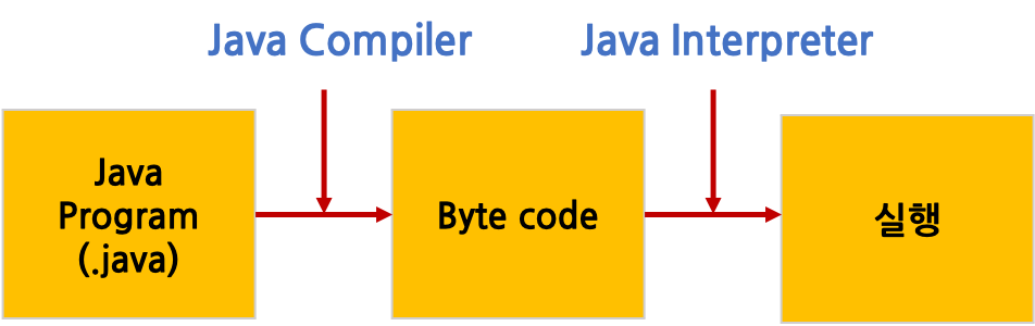 자바프로그램이 실행되는 순서를 아주 간략하게 살펴보면 아래와 같다. 자바 프로그램(.java)을 작성하고 이를 자바 컴파일러가 bytecode(.class) 로 변환시킨다. class 파일을 자바 인터프리터가 하드웨어가 식별 할 수 있는 언어(binary)로 해석해서 실행된다.
